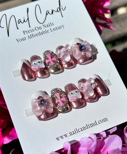 Handmade Stiletto Brown Gold Chrome Flower Nails