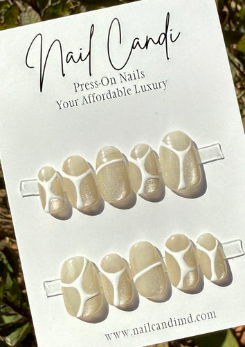 Handmade Medium Round Cream Cateye White Accent Nails
