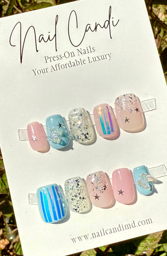 Handmade Short Square Cotton Candy Pink & Blue Butterfly Nails