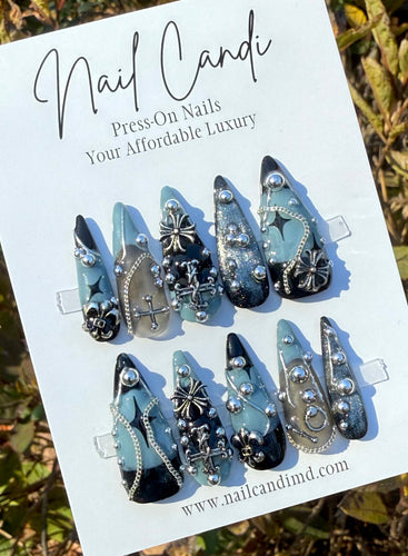 Handmade Long Stiletto Goth Y2K Silver Charm Nails