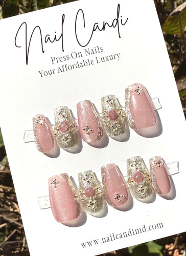 Handmade Short Square Silver & Gold Cateye Flower Nails