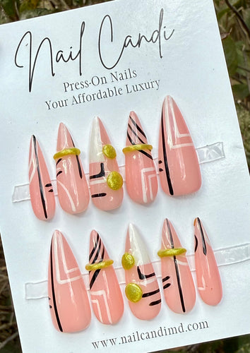 Handmade Long Stiletto Gold Bar Abstract Line Nails