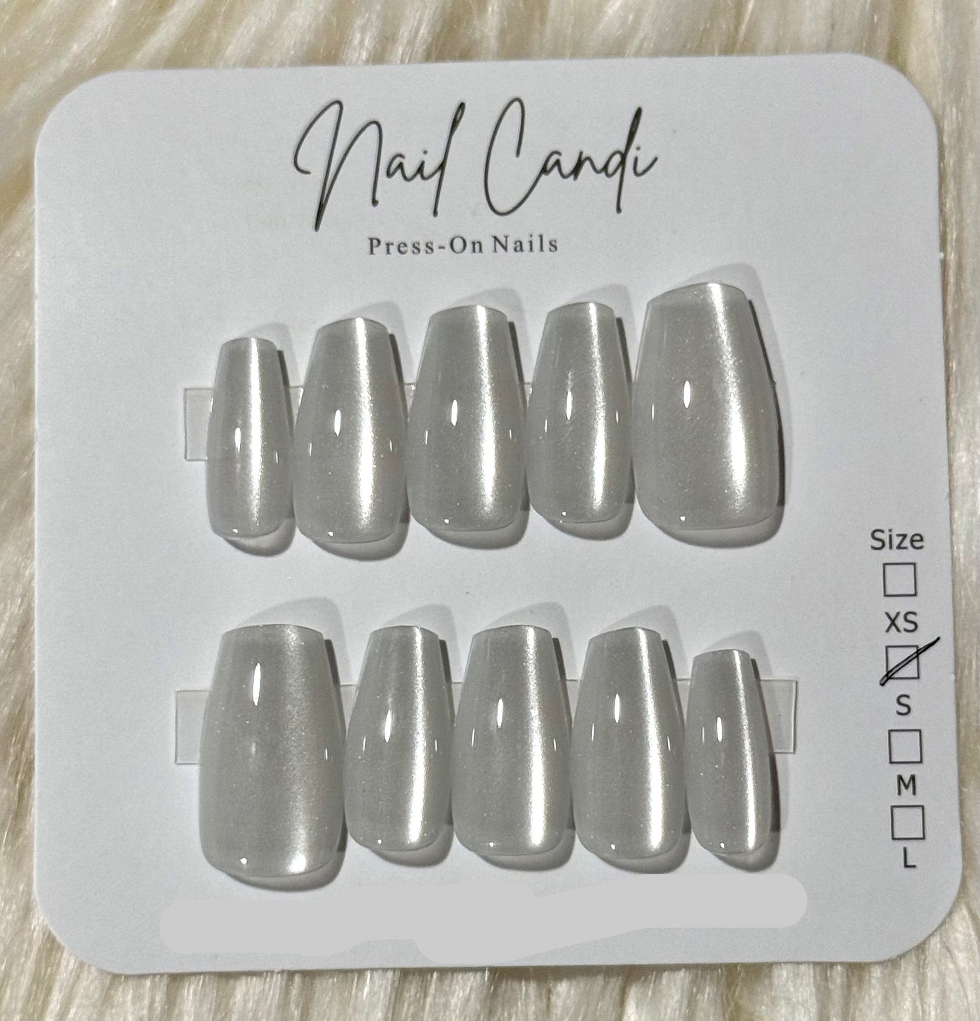 Silver press-on nails on a 'Nail Candi' branded card.