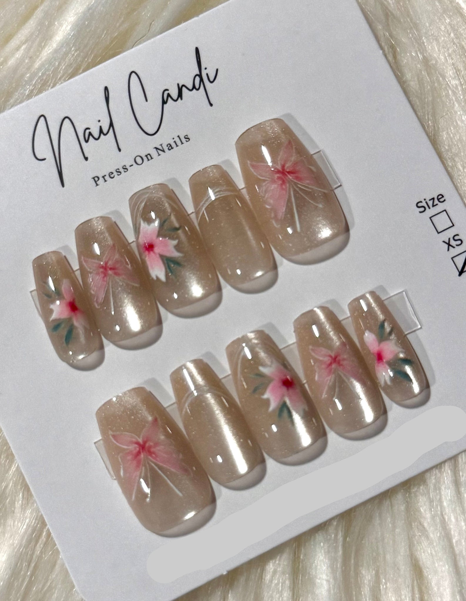 Set of press-on nails with floral designs on a white card with 'Nail Candi' branding.