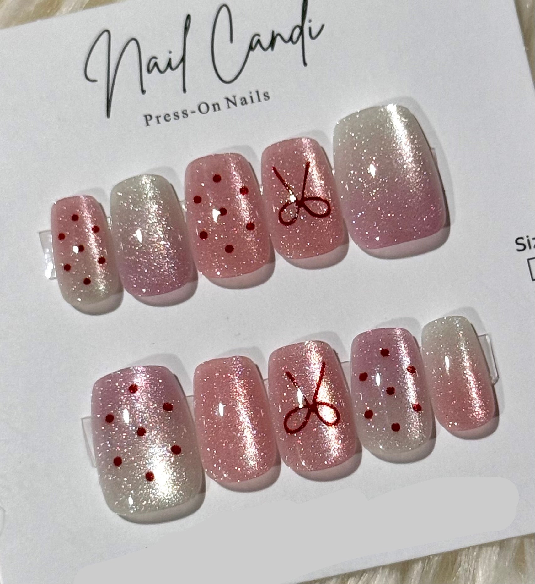 Semi-Handmade Short Pink Bow Polka Dot Nails
